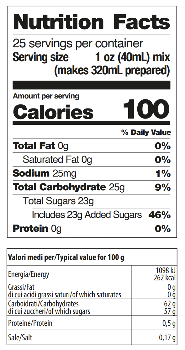 Zumo de piña concentrado (50%), azúcar, jarabe de glucosa y fructosa, zumo de limón concentrado, conservantes: E202, E211; aromatizantes, antioxidante: vitamina C.